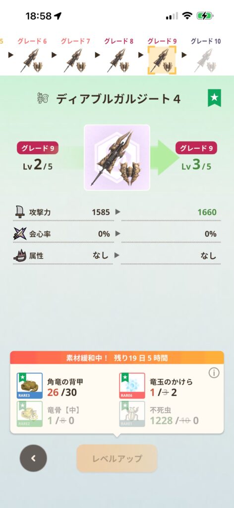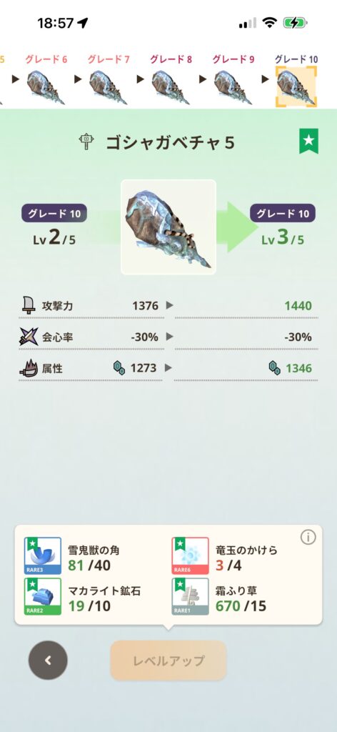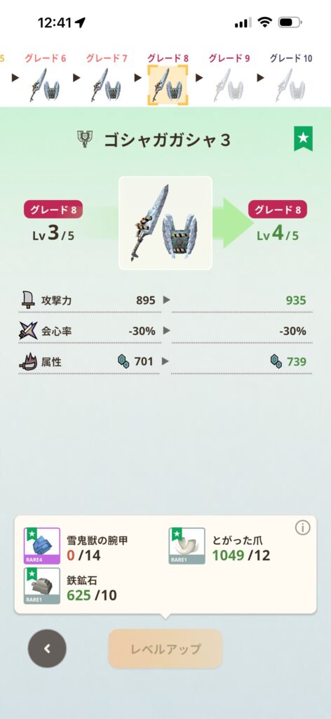 とりあえず最低限腰をG8-1にすることで攻撃Lv5にする必要があります。