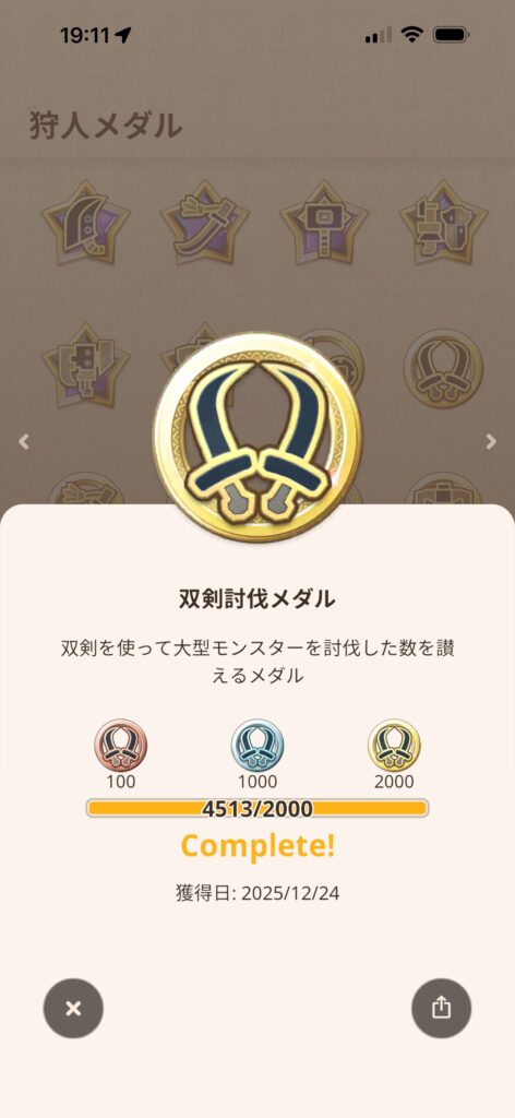 双剣討伐メダルは200そこそこだったものの、SPゲージ加速バージョンの使い勝手の良さのまま狩猟を続けていました。