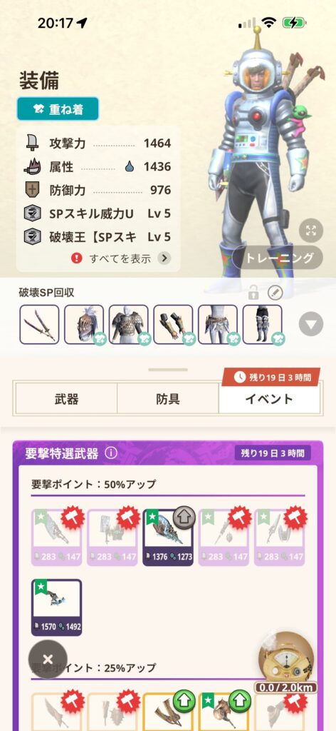 2/2からはじまっている漂移錬成イベントであらたなスキル「適性距離威力UP」が登場しましたが、こちらも含めて考えると面倒なため暫定的に凶会心属性バージョンの完成を目指しています。この装備とスキル構成であれば脚のみ変更するとゴシャハンマーでも一応使用可能となるため、完成しても腐らないことを願っています。